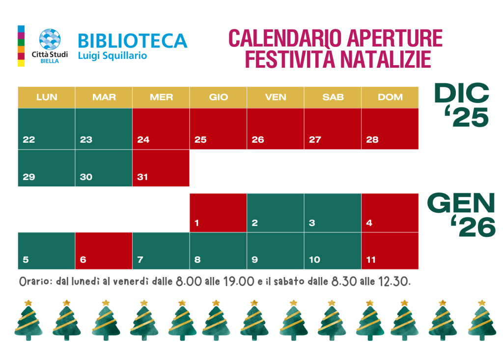 Durante le festività natalizie la biblioteca sarà aperta con il seguente calendario: