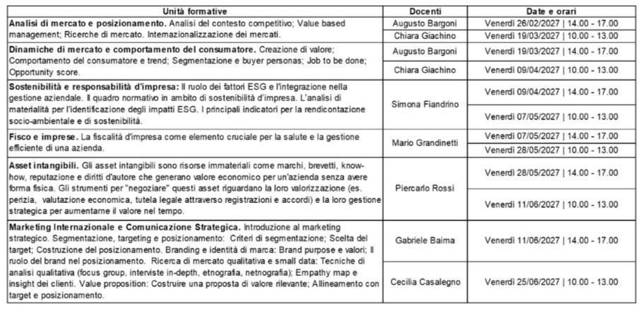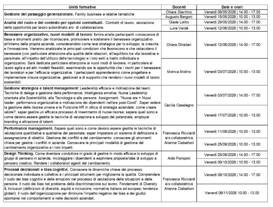 Il corso di perfezionamento, rivolto a imprenditori, manager, responsabili di area/reparto, dirigenti, professionisti, è accessibile a tutti coloro che abbiano conseguito il diploma di scuola superiore. La partecipazione è aperta sia a diplomati che a laureati che desiderino approfondire le proprie competenze.