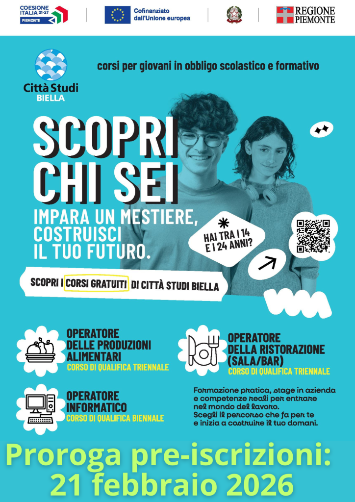 Città Studi Biella attiverà per l’anno formativo 2026/27 corsi completamente gratuiti, finanziati dalla Regione Piemonte, rivolti ai giovani in obbligo scolastico e formativo tra i 14 e i 24 anni.
