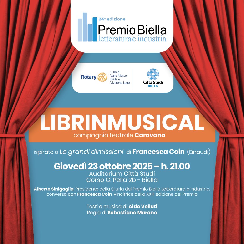 Giovedì 23 ottobre alle ore 21, con ingresso gratuito, l’Auditorium di Città Studi (Corso Pella 2b, Biella) ospiterà LIBRINMUSICAL, appuntamento inserito nella XXIV edizione del Premio Biella Letteratura e Industria, promosso e organizzato da Città Studi Biella. L’edizione 2025 è realizzata in collaborazione con il Rotary Valle Mosso, principale partner dell’iniziativa, con il contributo del Rotary Viverone Lago, nell’ambito del sostegno che i Rotary Club del Biellese offrono ogni anno a rotazione al progetto.